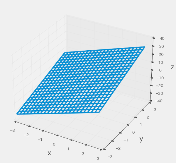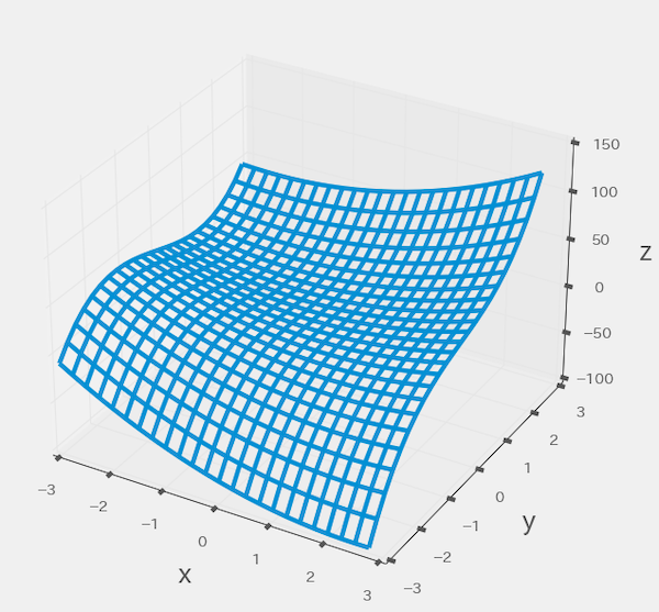次の図は、問題文の式をグラフ化したものです。縦軸の「z」は、左辺の「f(x,y)」です。