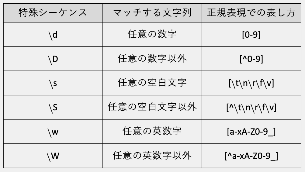 正規表現でよく使う特殊文字は以下となります。