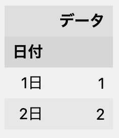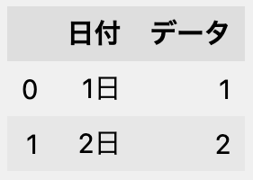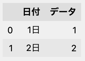 「日付」の列は文字列のためobjectとなり、「データ」の列は整数のため「int64」となります。