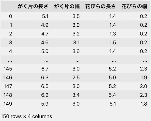 問題文の「iris.data」は、「がく片の長さ」など4つの次元(説明変数)が格納されています。