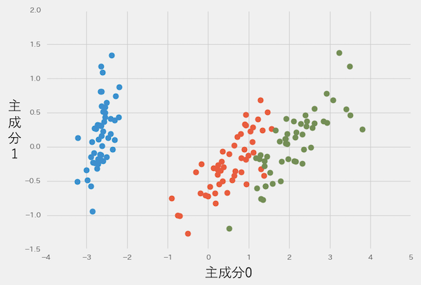 irisデータは「iris.target」に正解データがありますが、今回のように主成分分析をすることで、正解データがなくてもirisを3種類にクラスタリングできます。